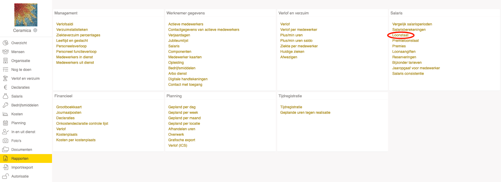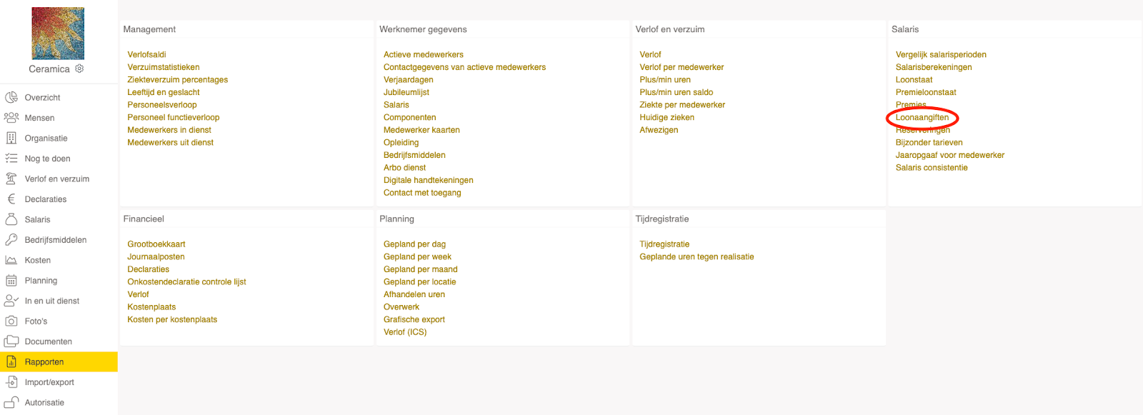 Open het rapport 'Loonaangiften' onder het kopje 'Salaris'