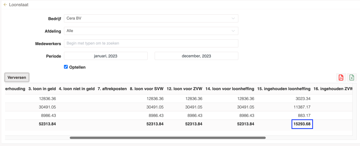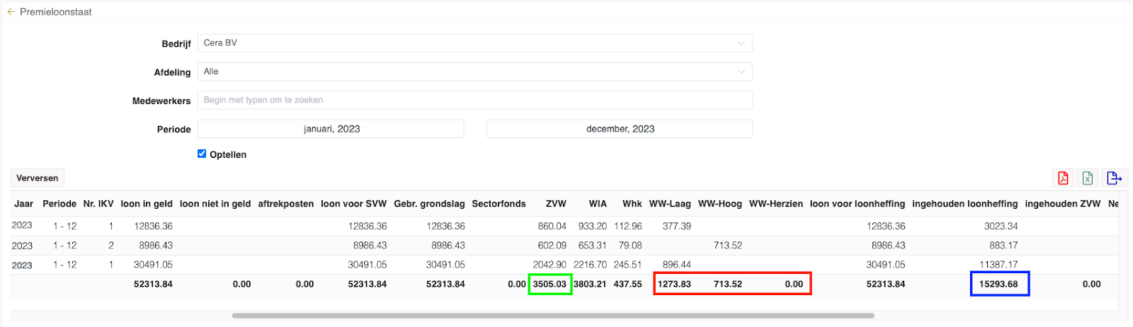 Zet de filters in dit rapport hetzelfde als je gedaan heeft bij het rapport Premieloonstaat en klik op 'Verversen':