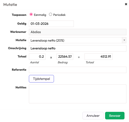 - Een component van het type Netto vergoeding, deze noem je 'Levensloop netto (onbelast in de wkr)'.
