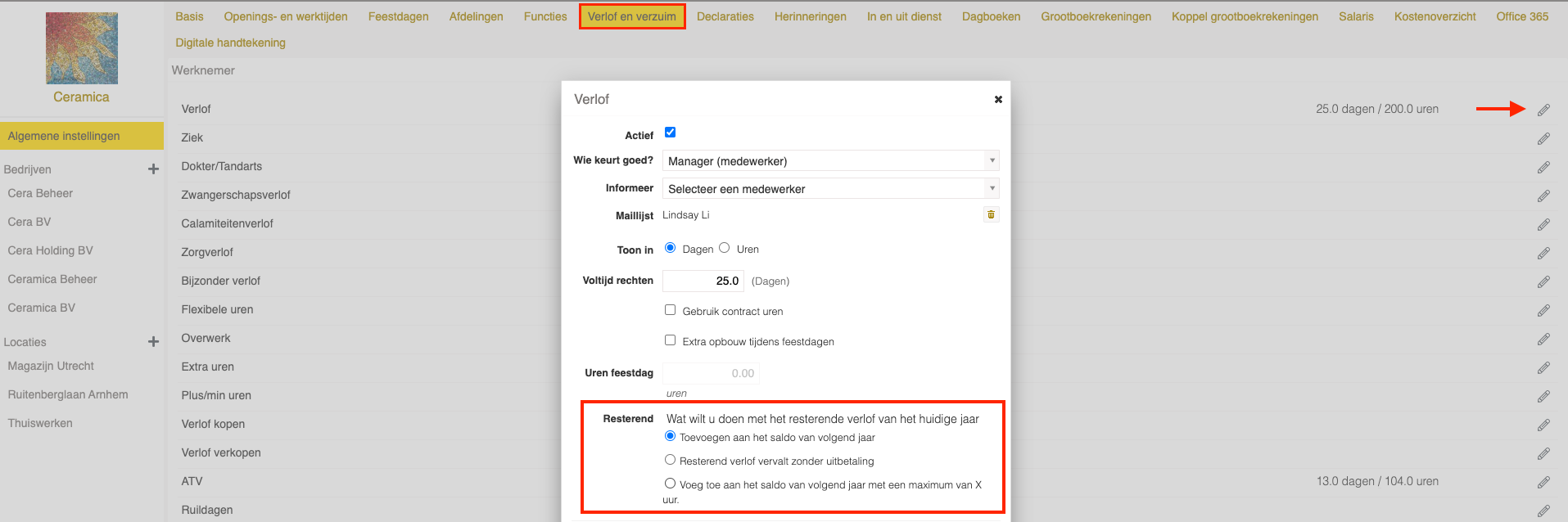 Bijvoorbeeld: Je hebt ingesteld dat een medewerker 24 uur mag meenemen en dat de rest komt te vervallen.