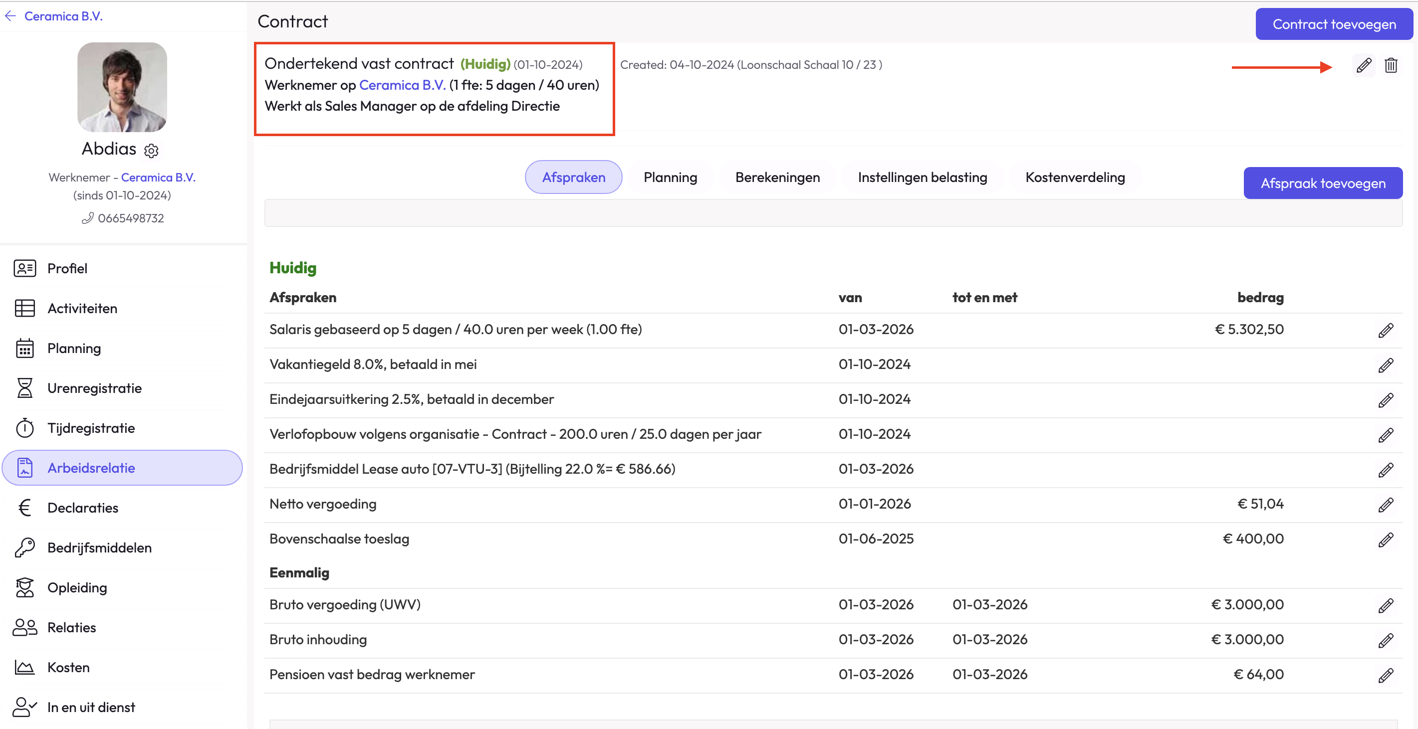 Bovenin staat het 'Huidige contract' van de medewerker.