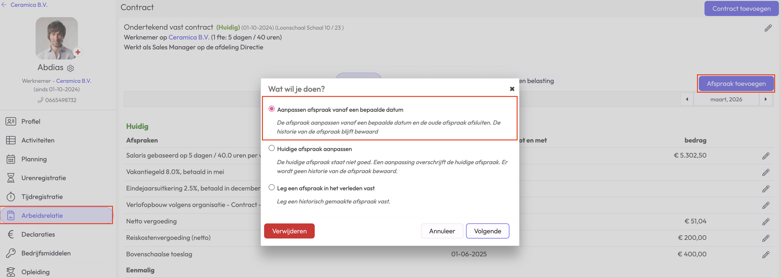 Het is niet per se nodig om een nieuw contract toe te voegen wanneer alleen het aantal uren verandert. Wanneer binnen dezelfde arbeidsovereenkomst, bijvoorbeeld een contract voor onbepaalde tijd, het aantal uur veranderd, kan dit aangepast worden door de salarisafspraak aan te passen vanaf een bepaalde datum. Dit kan je doen door naar de arbeidsrelatie van de medewerker te gaan en vervolgens de salaris afspraak aan te passen vanaf een bepaalde datum: