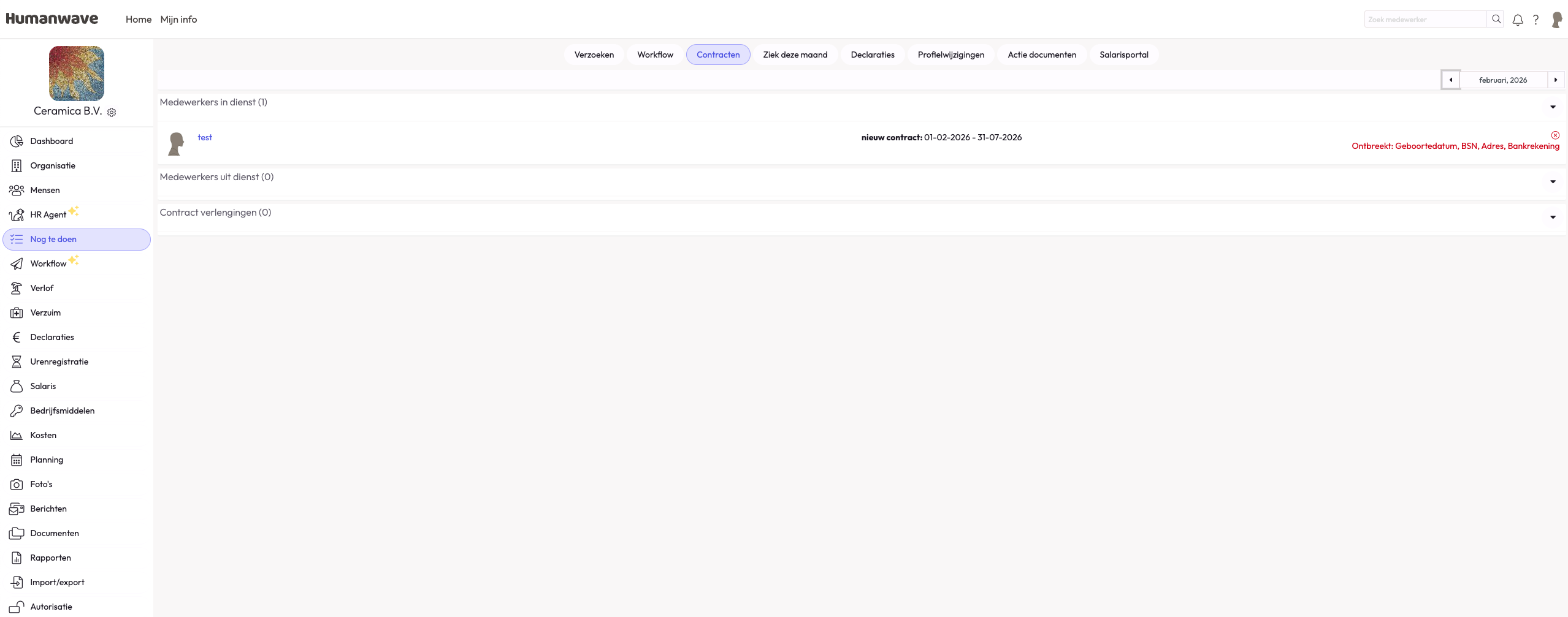 Onder 'Nog te doen' is een nieuw tabblad toegevoegd: "Contracten". Hier krijg je een overzicht van alle beginnende en vertrekkende medewerkers en medewerkers die verlengd zijn in de huidige maand. Zo kun je snel controleren of er nog acties moeten genomen worden rondom het personeelsverloop.