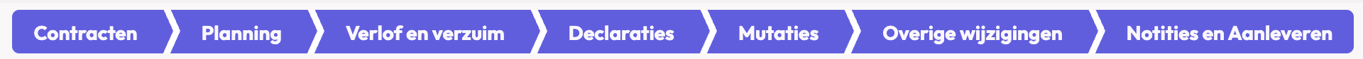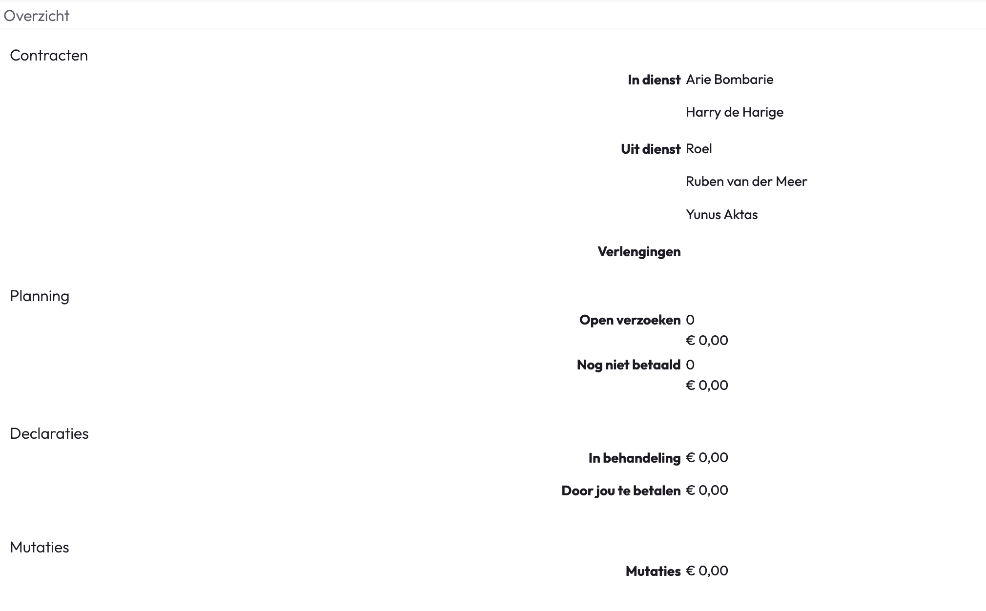 Onder het 'Overzicht' worden de contracten, planningsverzoeken, verlof en verzuim aanvragen, declaraties en mutaties opgesomd.