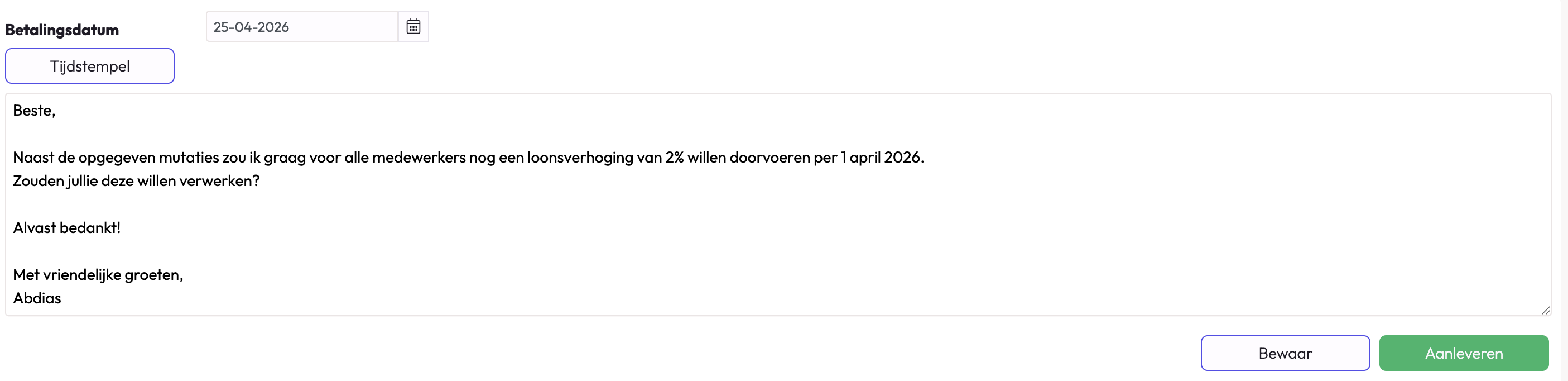 Wanneer het mutatieformulier is gecontroleerd, de betaaldatum en eventueel een notitie is toegevoegd, kun je het formulier versturen.