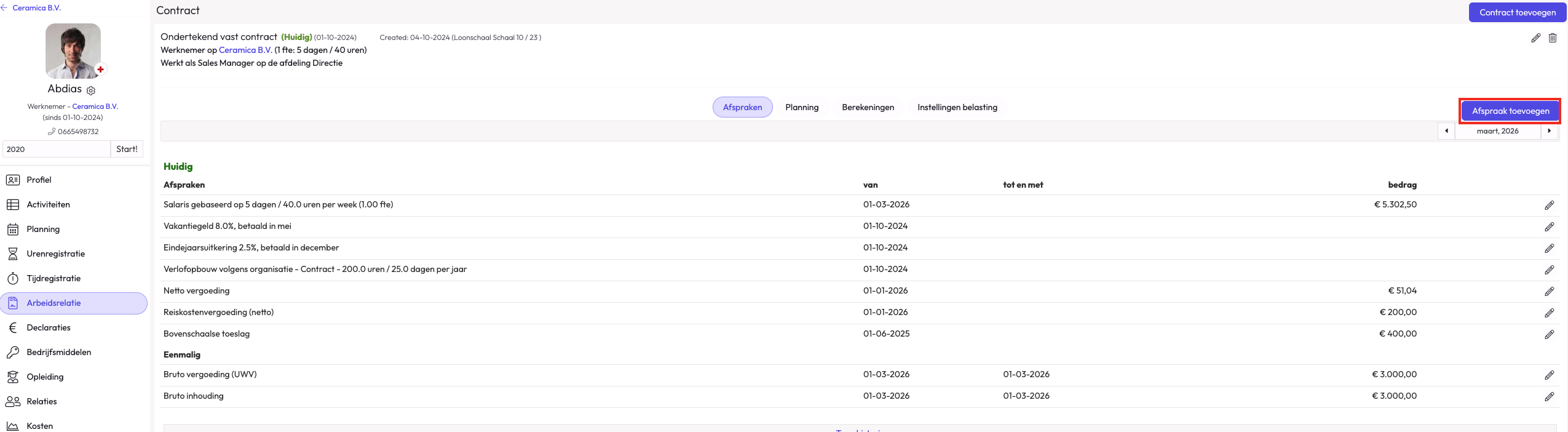 Beide componenten staan nu tussen de salariscomponenten. Deze kunnen toegevoegd worden in de Arbeidsrelatie van de medewerker, via de button 'Afspraak toevoegen'.