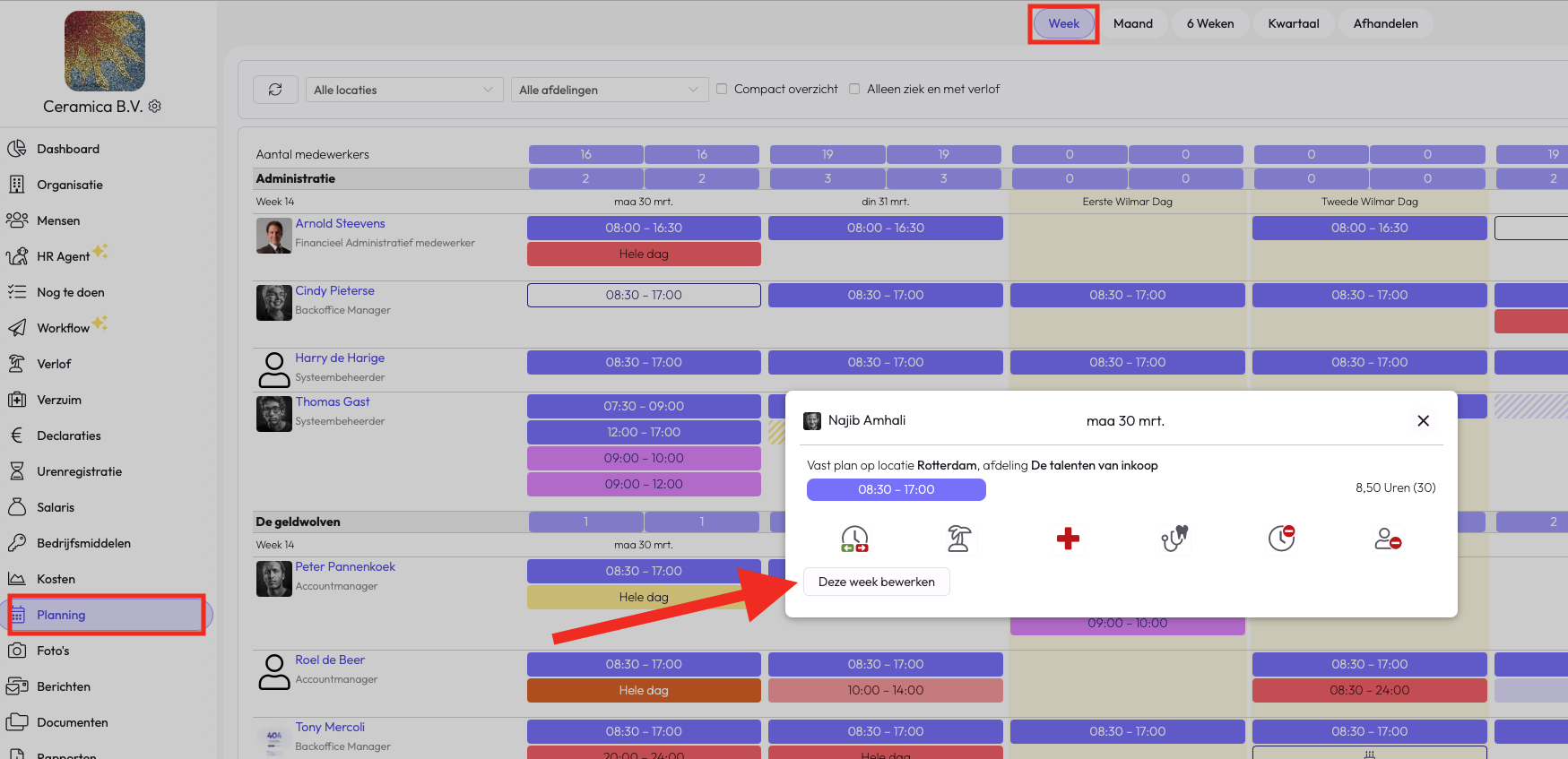 Ga naar de organisatie planning en klik op het vaste plan van de medewerker welke je wilt aanpassen voor deze week.