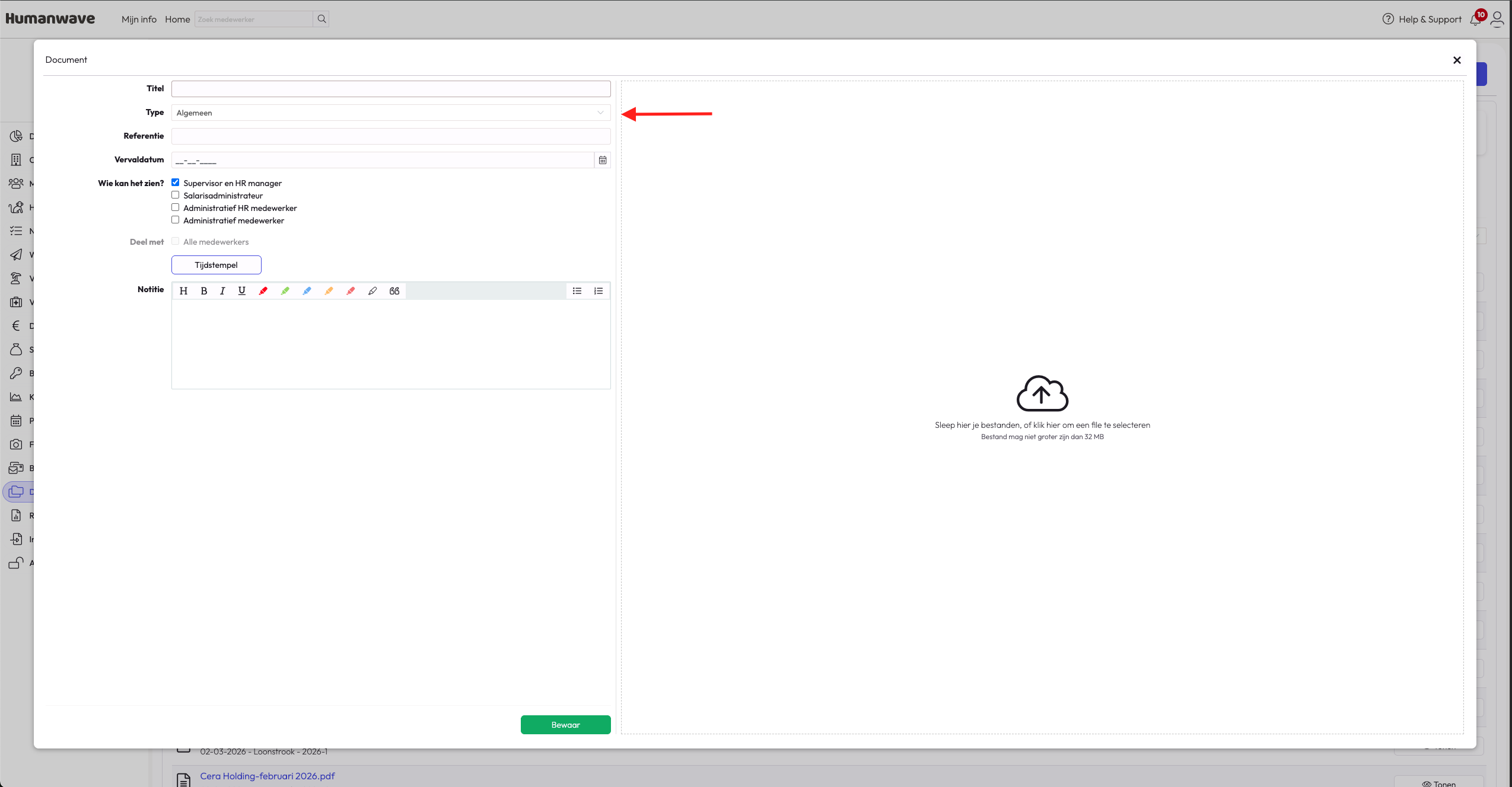 Wil je documenten doorgeven die van invloed zijn op de salarisverwerking? Denk hierbij aan een brief over een loonbeslag, een bevestiging van een salarisverhoging of andere bijlagen die relevant zijn voor de salarisrun. In Humanwave doe je dit veilig en snel via de organisatiedocumenten.