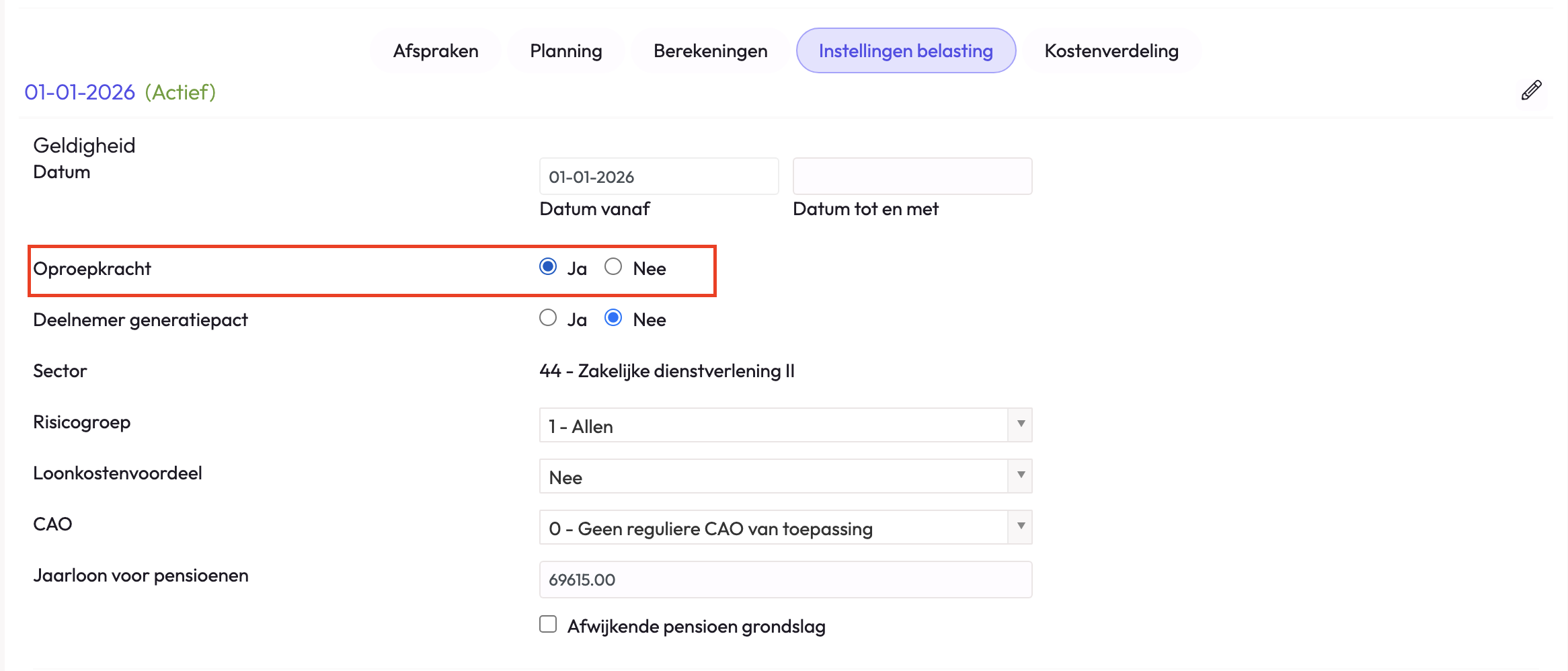 Wanneer de medewerker van vaste uren naar oproepkracht gaat, of van oproepkracht naar vaste uren, dan dien je dit ook aan te passen in het tabblad 'Arbeidsrelatie'.