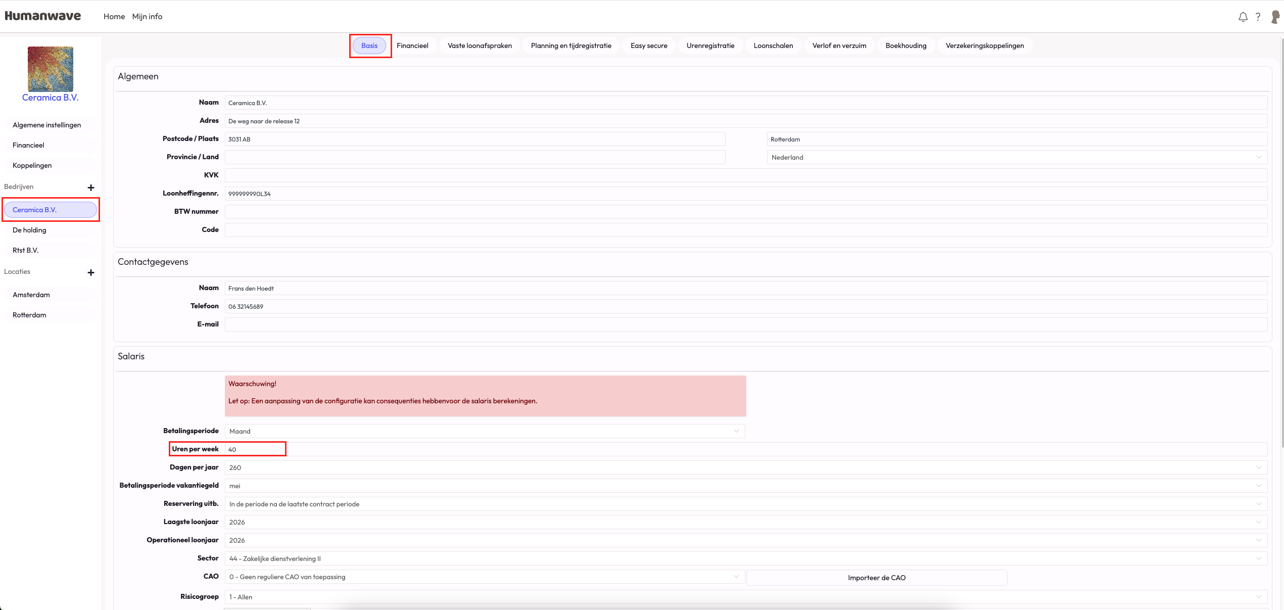 Bij het aanmaken van een organisatie binnen humwanwave worden deze voltijdsuren op 40 gezet. Werkt je organisatie met een werkweek van 40 uur, dan hoef je niets aan te passen. Werkt je organisatie met minder uren (bijvoorbeeld 36 of 38 uur) dan dien je de uren per week aan te passen. Dit kan in de instellingen per bedrijf. Onder salaris op de tab basis kan je hier de voltijdsuren aanpassen.