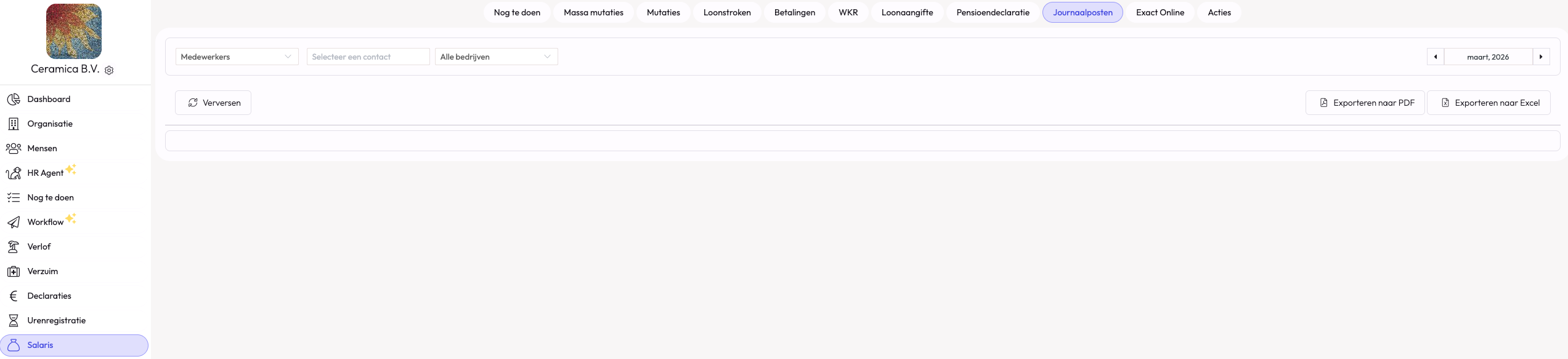 Je vindt de journaalpost per periode binnen Humanwave op organisatieniveau, onder de tab 'Salaris' en vervolgens onder de kop 'Journaalposten'.