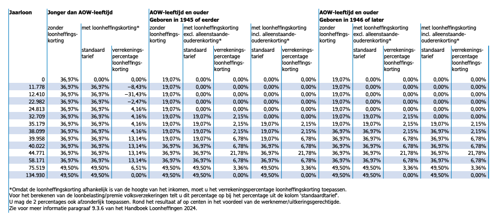 Wanneer er géén loonheffingskorting wordt toegepast zijn er in 2024 2 tarieven: