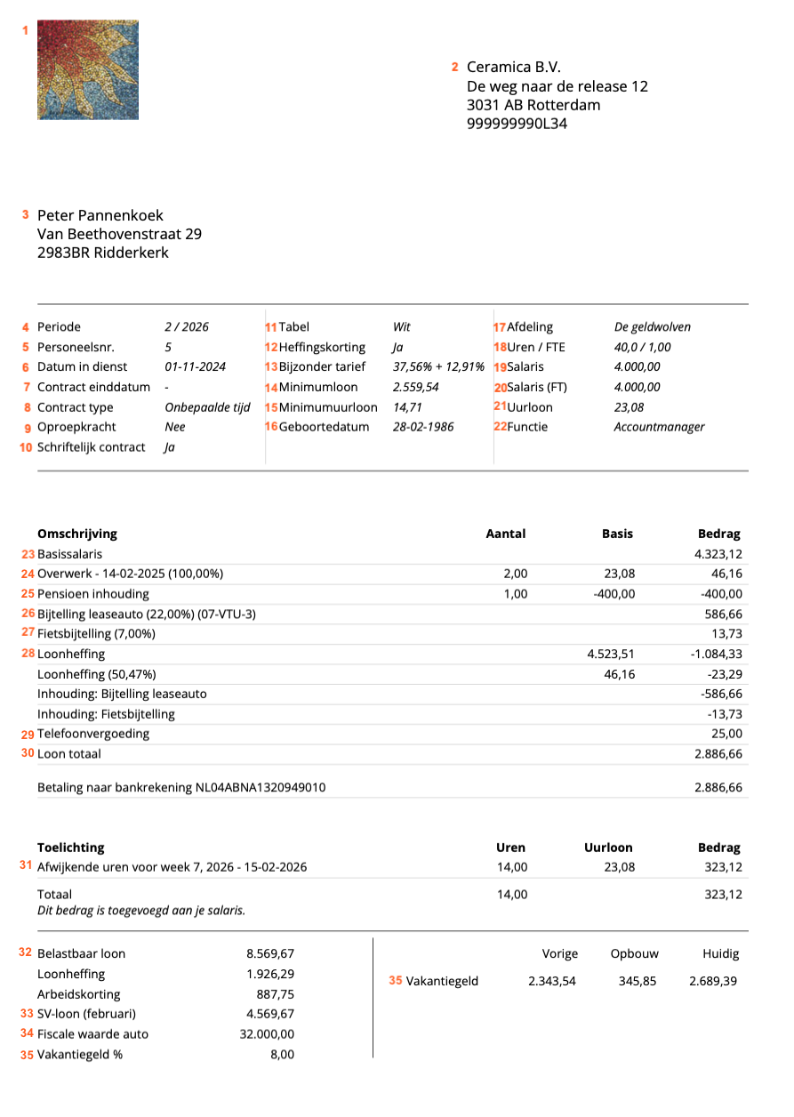 Binnen Humanwave wordt de salarisstrook volgens een vast template gegenereerd. Je kan de volgende componenten terugvinden op de strook: