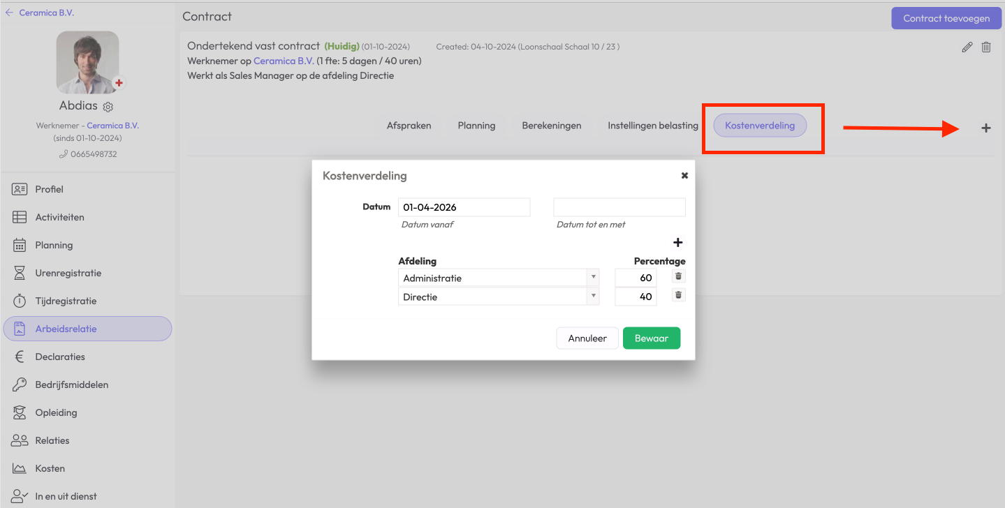In de basis kijkt Humanwave naar de afdeling waarop de medewerker staat in het Profiel onder het tabblad "Over". Heb je geen specifieke verdeling bij een medewerker toegevoegd, dan komen de kosten 100% op deze afdeling te staan. Wil je de kosten van de medewerker percentueel over meerdere afdelingen verdelen? Dan kan dat in de arbeidsrelatie van de medewerker.
