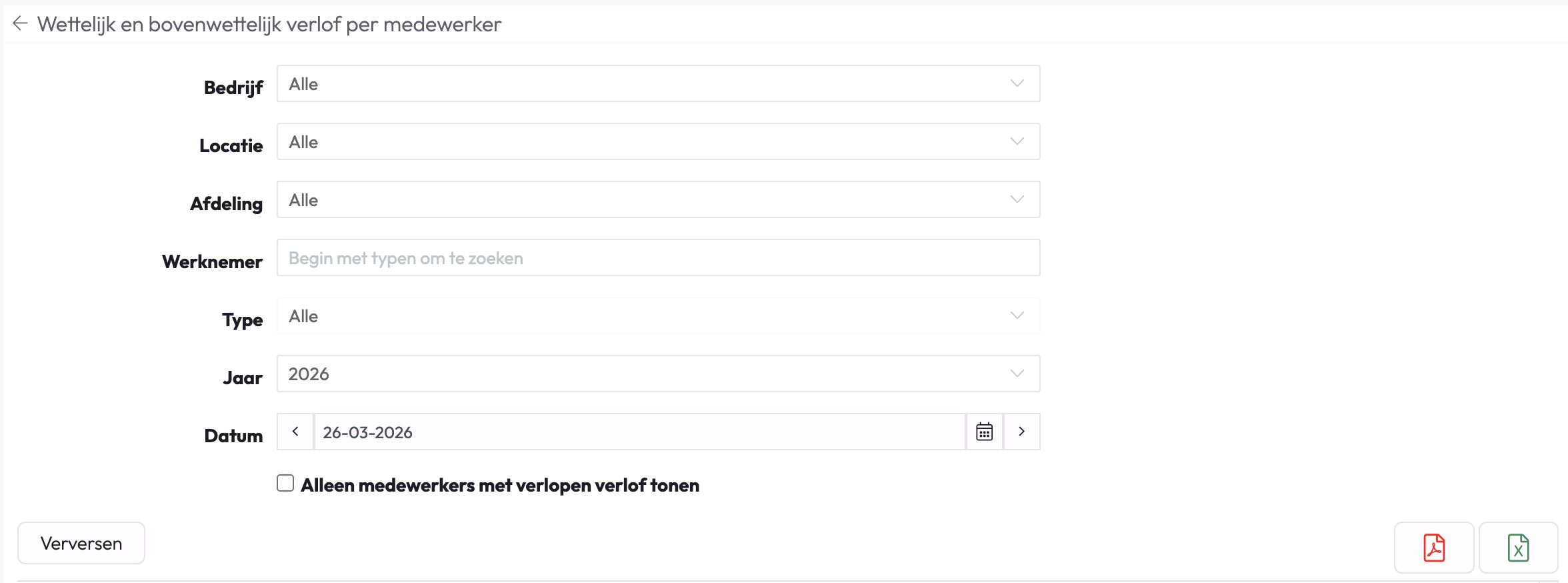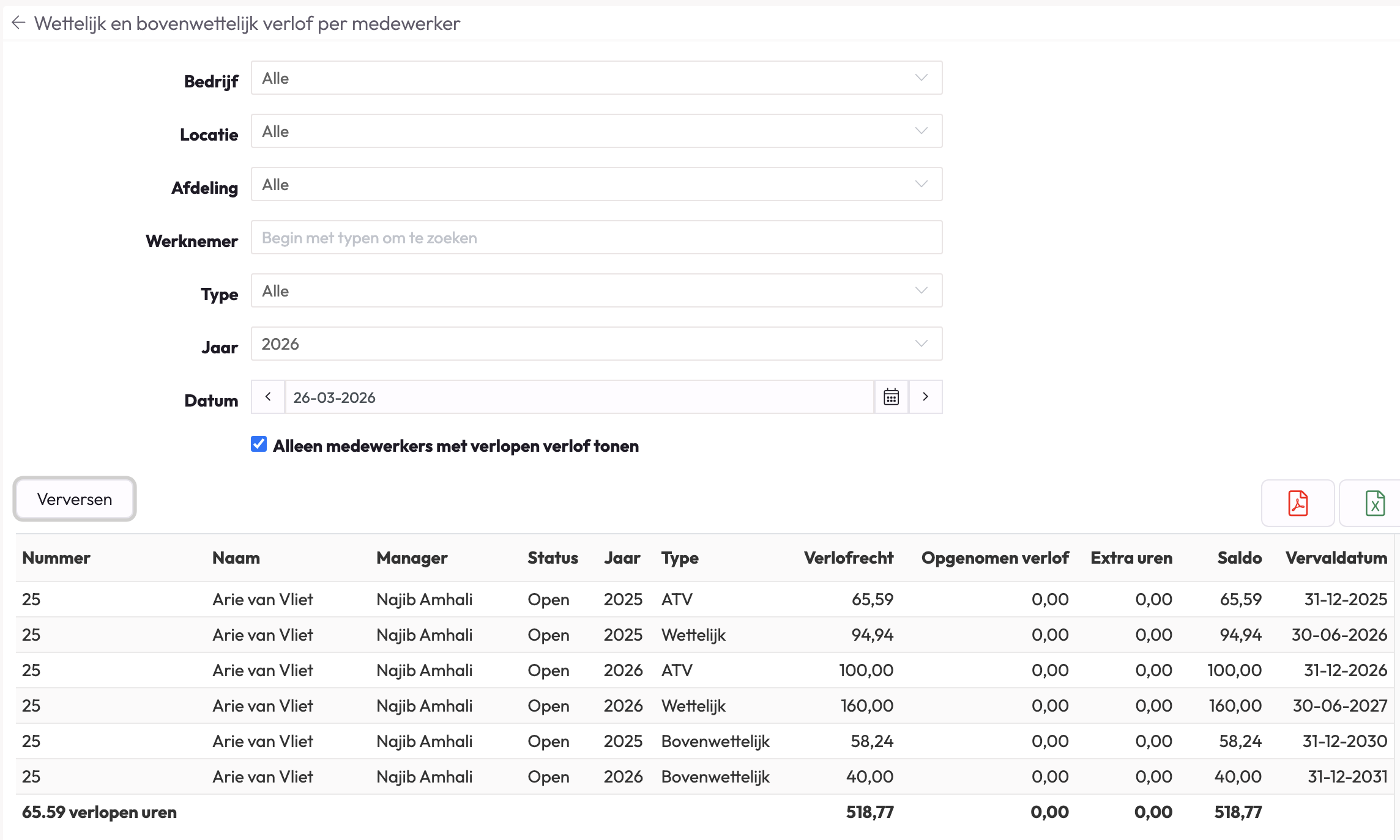Het rapport 'Wettelijk en bovenwettelijk verlof per medewerker' geeft je direct inzicht in de openstaande verlofpotjes van de medewerkers en of er verlof mag komen te vervallen omdat de vervaldatum nadert of al gepasseerd is.