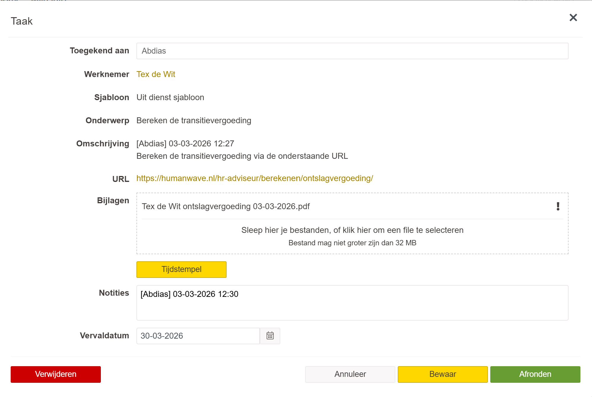In het bovenstaande voorbeeld is er een ontslag vergoeding toegevoegd aan het dossier van Tex de Wit.