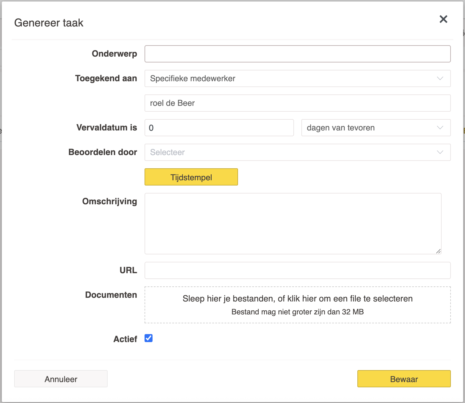 Actief: Bepaalt of deze taak aangemaakt wordt bij het genereren van het sjabloon.