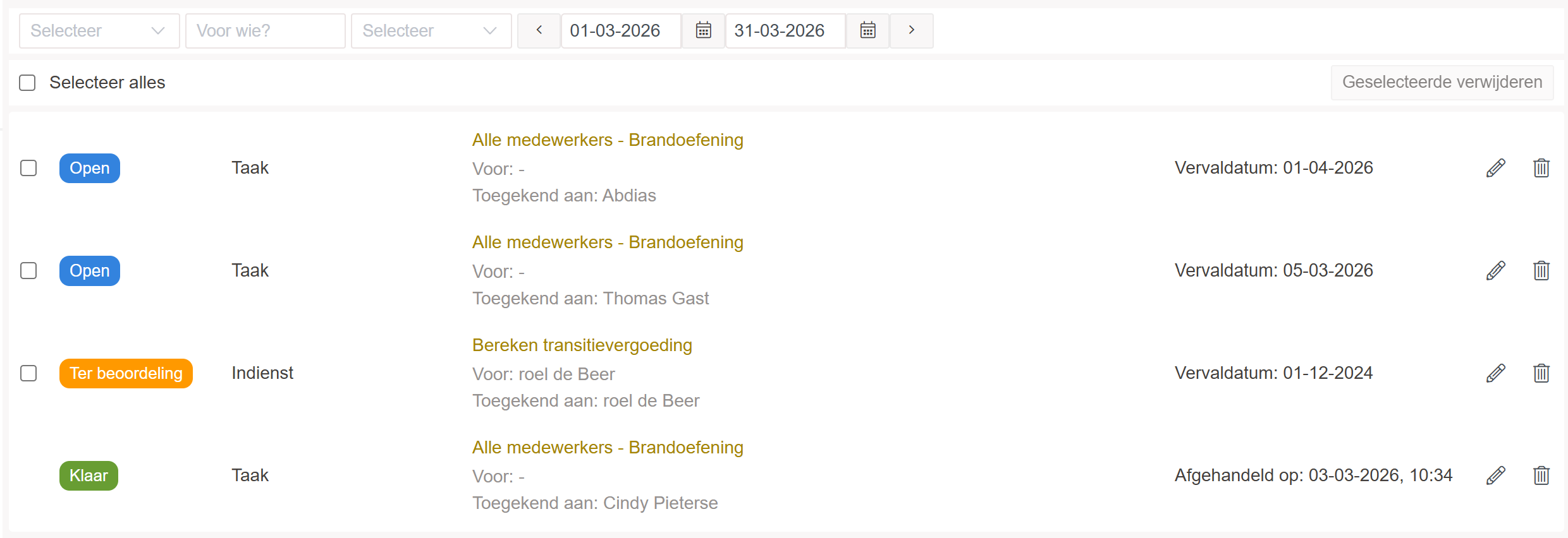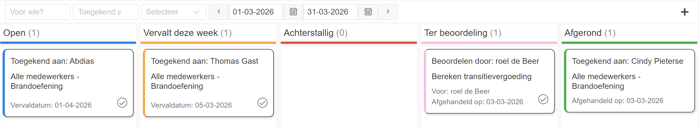 Dit wordt gebruikt om alle afgeronde taken te zien in een periode, alle open en te beoordelen taken, worden altijd getoond.