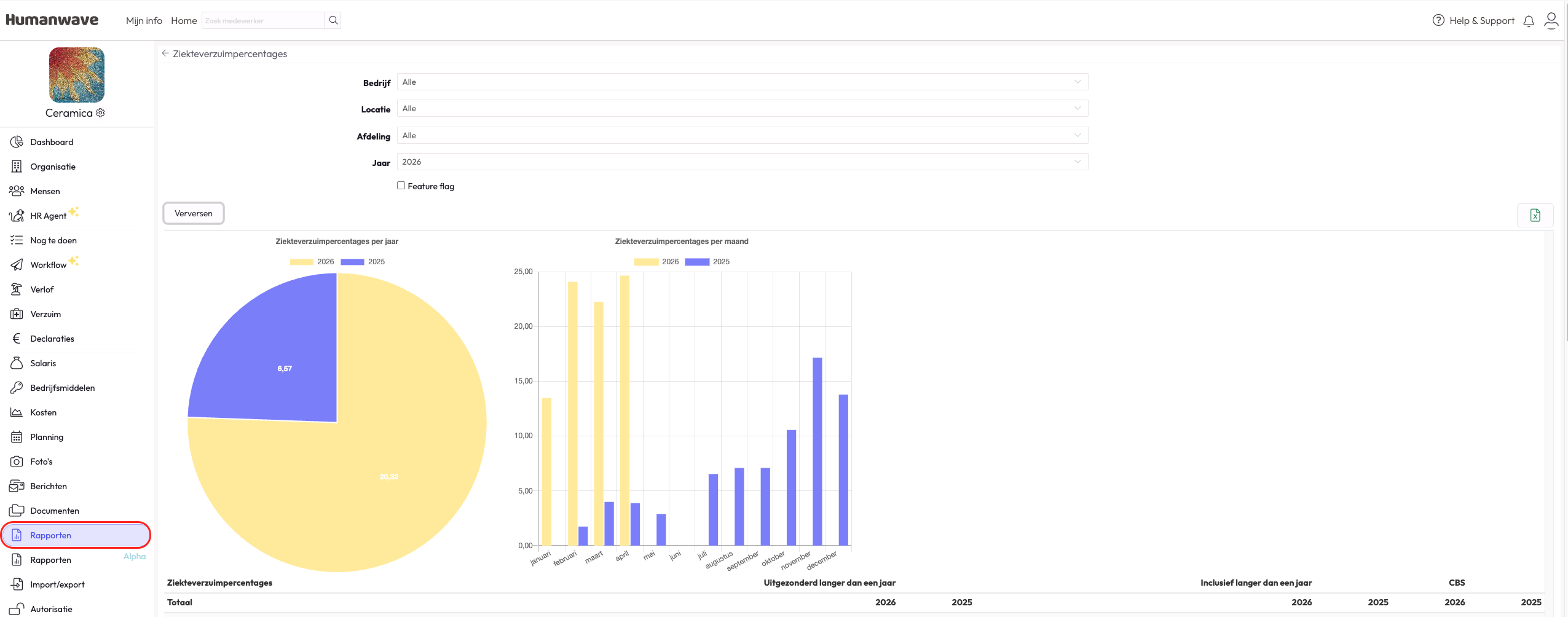 Om je een duidelijker beeld te geven over hoe de ziekteverzuimpercentages van het huidige jaar zich verhouden tegen de ziekteverzuimpercentages van vorig jaar, hebben we twee grafische weergaven toegevoegd in het rapport "Ziekteverzuimpercentage".
